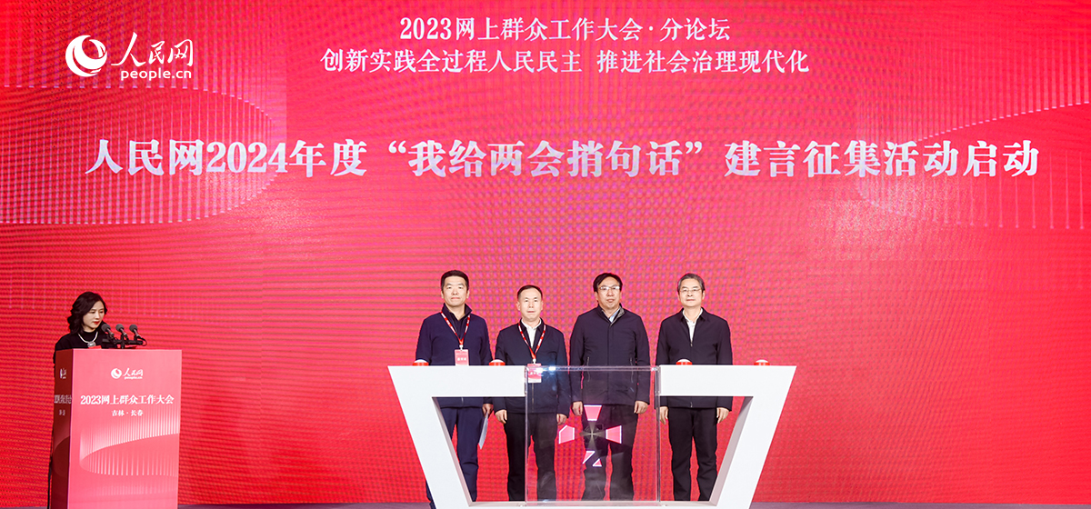 在2023网上群众工作大会上,人民网党委委员、监事会主席唐维红发布人民网《人民建议》新版上线消息,人民网副总编辑杨义、黑龙江省信访局副局长朱莉、辽宁省营商环境建设局企业服务处处长张加宁、吉林省委办公厅网络舆情处处长杨壮、内蒙古自治区研究室信息研究处副处长陈晓庆及人民网东北地区4位分公司负责人共同启动“新时代推动东北全面振兴人民建议征集”活动。